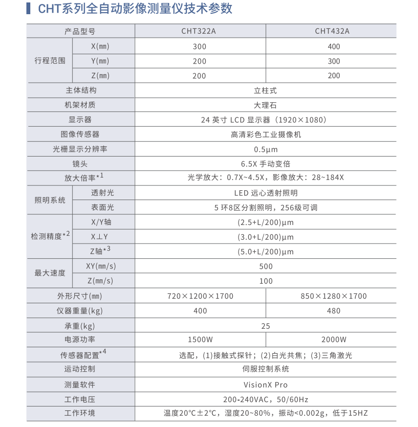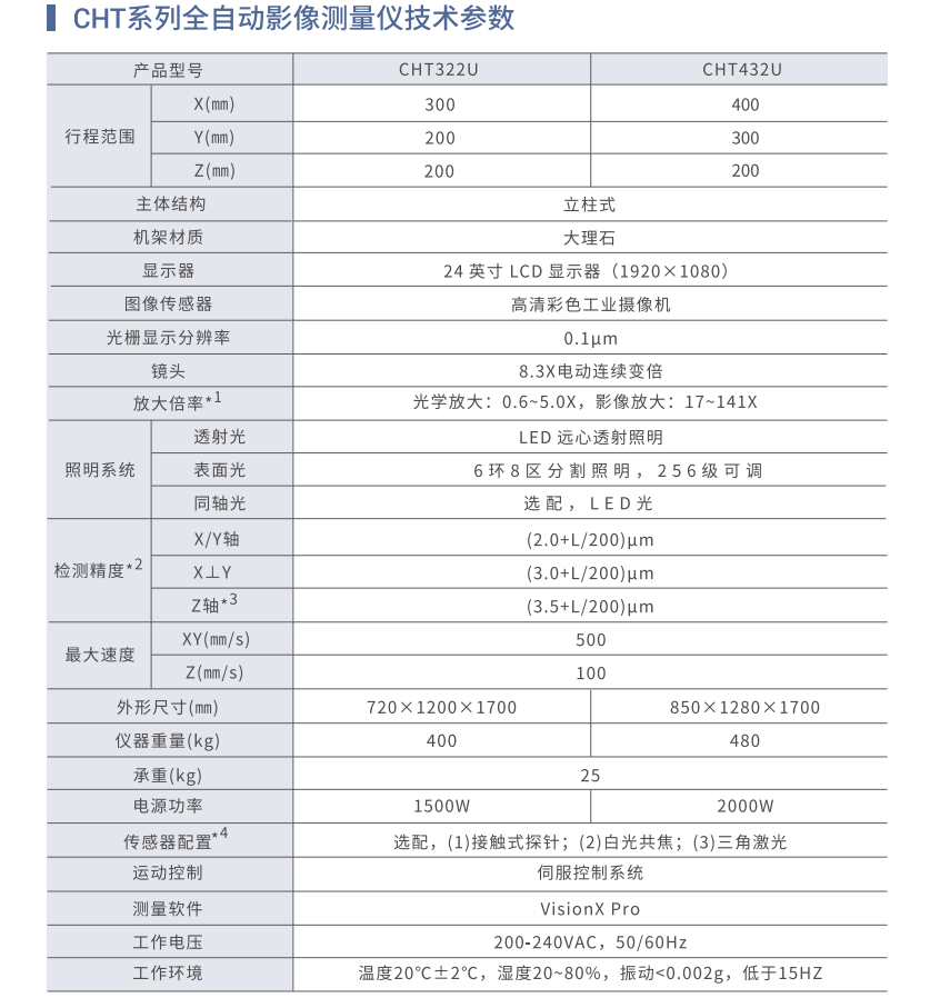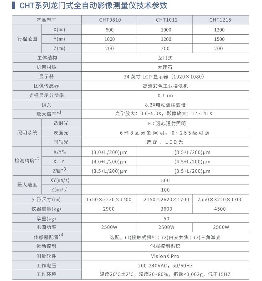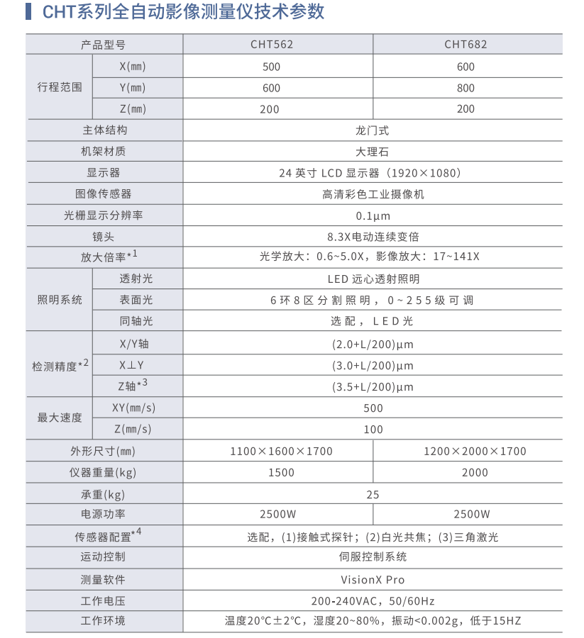 CHT系列全自动影像测量仪覆盖不同的量程,采用大理石主体机台,精密伺服控制系统和光学电动变倍镜头,实现高精度测量。CHT系列圈自动影像仪功能强大,可实现各种复杂零件的表面尺寸,轮廓,角度与位置,形位公差等精密测量。